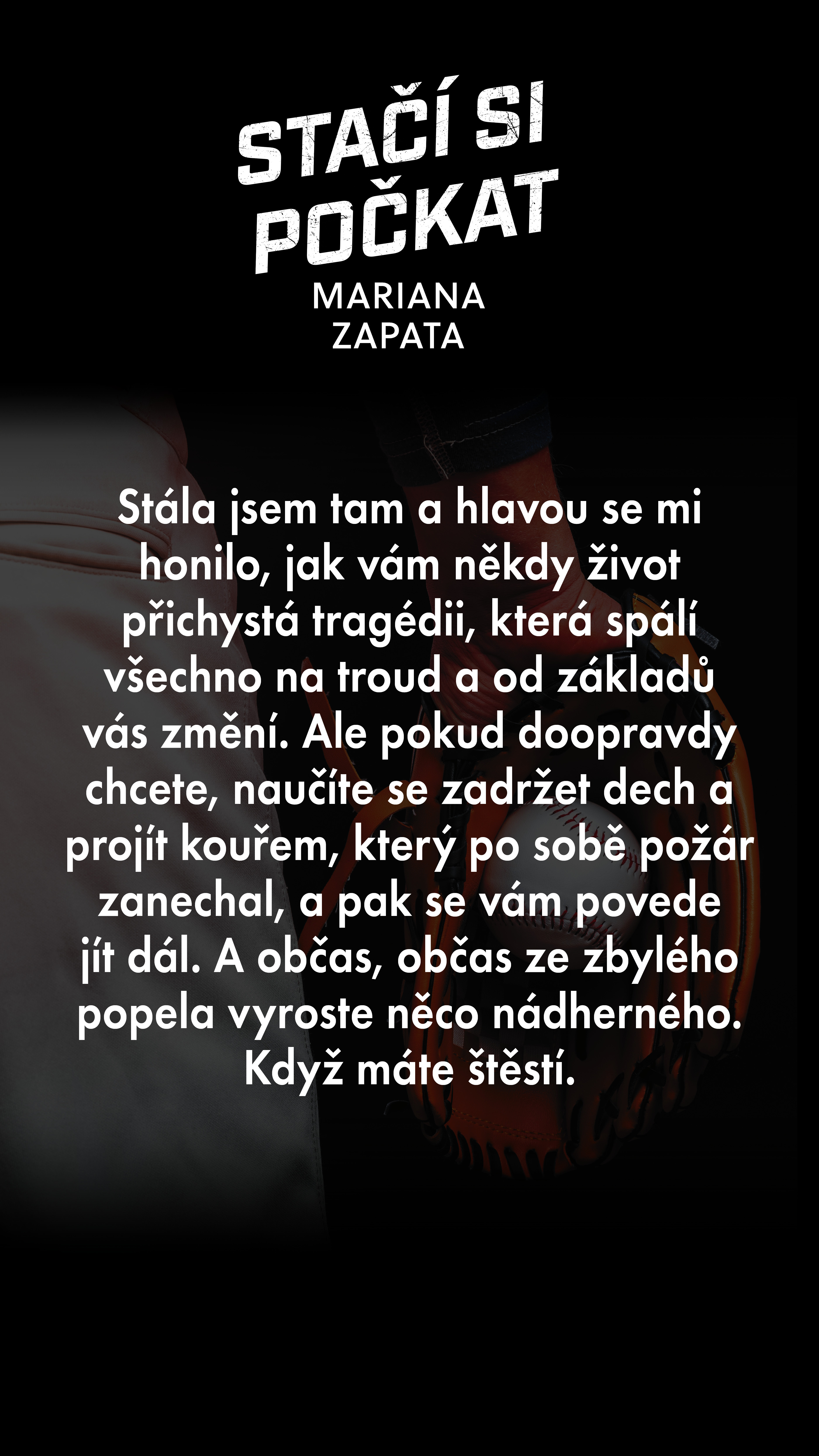 Stála jsem tam a hlavou se mi honilo, jak vám někdy život přichystá tragédii, která spálí všechno na troud a od základů vás změní. Ale pokud doopravdy chcete, naučíte se zadržet dech a projít kouřem, který po sobě požár zanechal, a pak se vám povede jít dál. A občas, občas ze zbylého popela vyroste něco nádherného. Když máte štěstí.