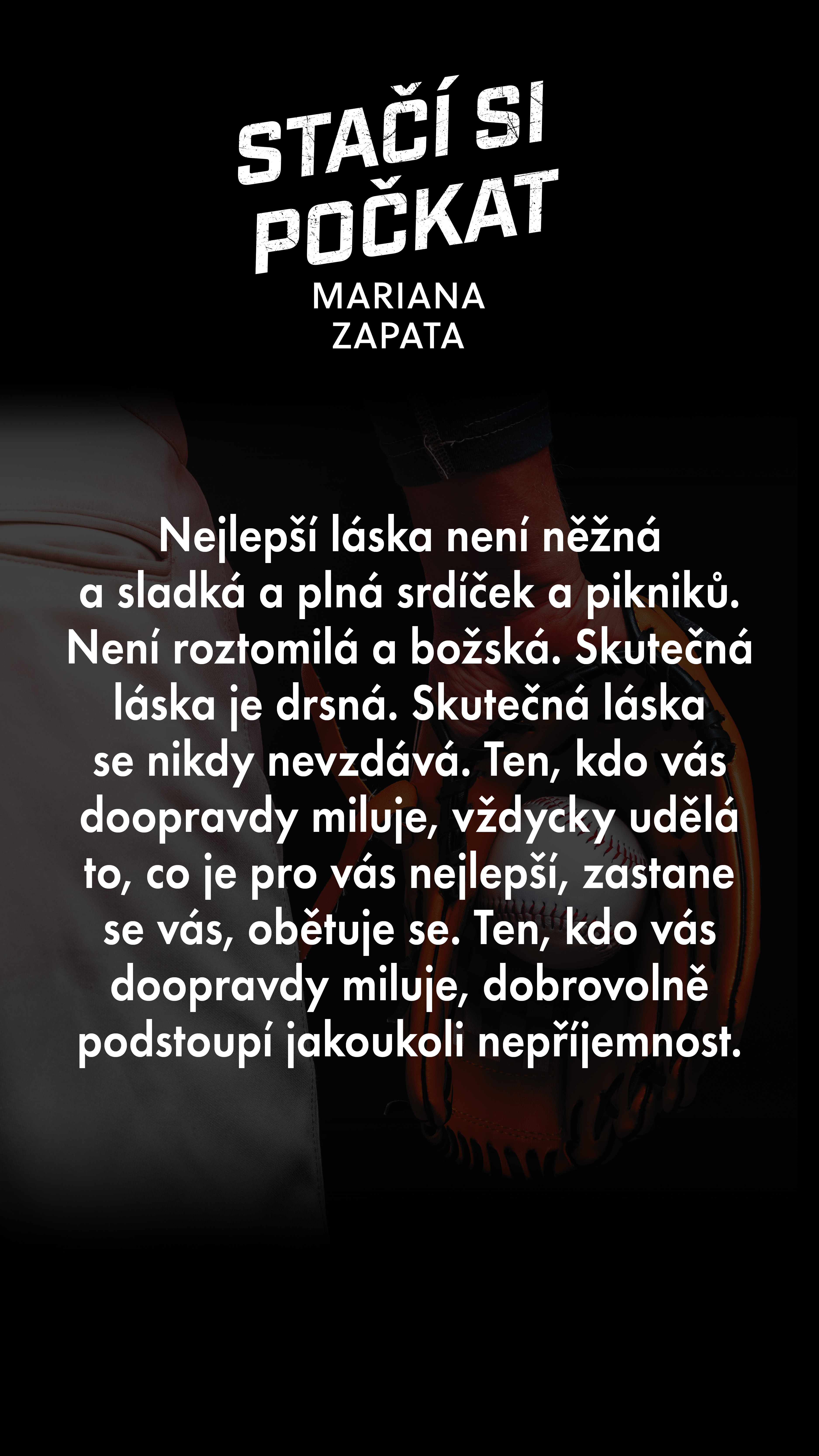Nejlepší láska není něžná a sladká a plná srdíček a pikniků. Není roztomilá a božská. Skutečná láska je drsná. Skutečná láska se nikdy nevzdává. Ten, kdo vás doopravdy miluje, vždycky udělá to, co je pro vás nejlepší, zastane se vás, obětuje se. Ten, kdo vás doopravdy miluje, dobrovolně podstoupí jakoukoli nepříjemnost.