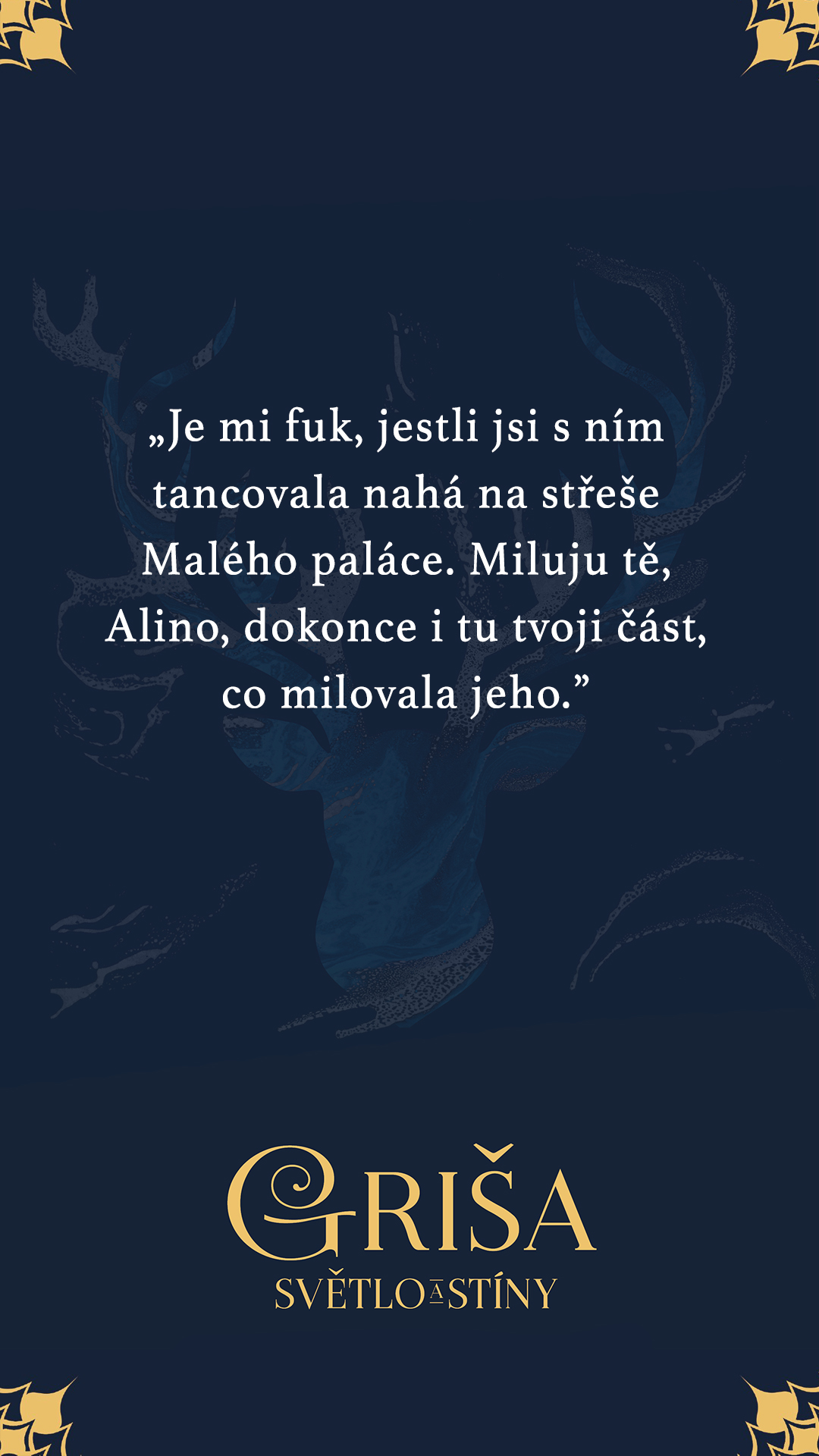 Je mi fuk, jestli jsi s ním tancovala nahá na střeše Malého paláce. Miluju tě, Alino, dokonce i tu tvoji část, co milovala jeho.