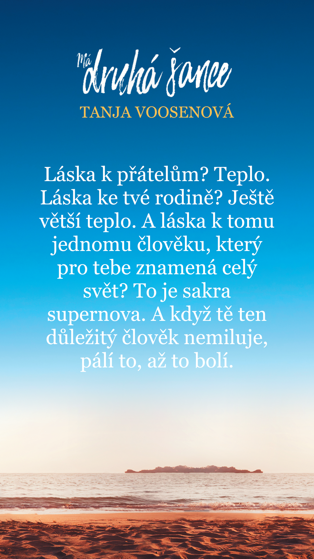 Láska k přátelům? Teplo. Láska ke tvé rodině? Ještě větší teplo. A láska k tomu jednomu člověku, který pro tebe znamená celý svět? To je sakra supernova. A když tě ten důležitý člověk nemiluje, pálí to, až to bolí.
