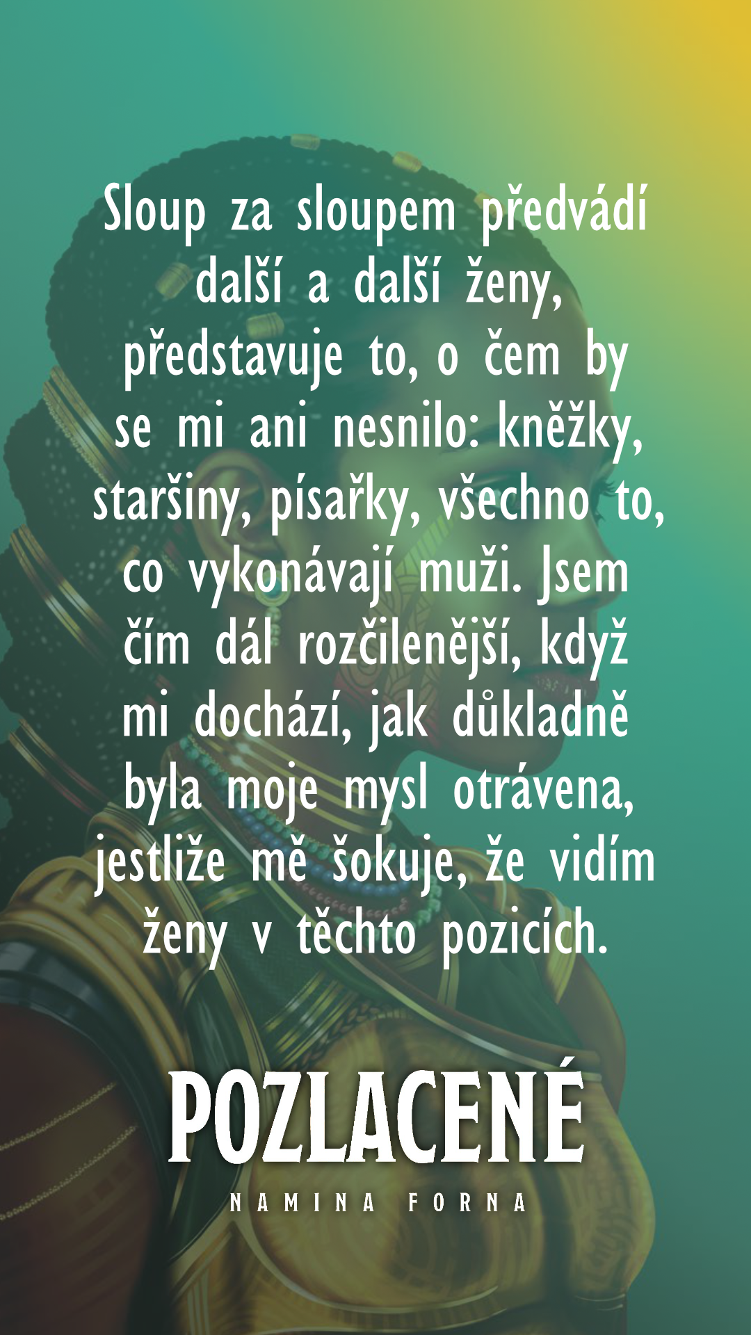 Sloup za sloupem předvádí další a další ženy, představuje to, o čem by se mi ani nesnilo: kněžky, staršiny, písařky, všechno to, co vykonávají muži. Jsem čím dál rozčilenější, když mi dochází, jak důkladně byla moje mysl otrávena, jestliže mě šokuje, že vidím ženy v těchto pozicích.