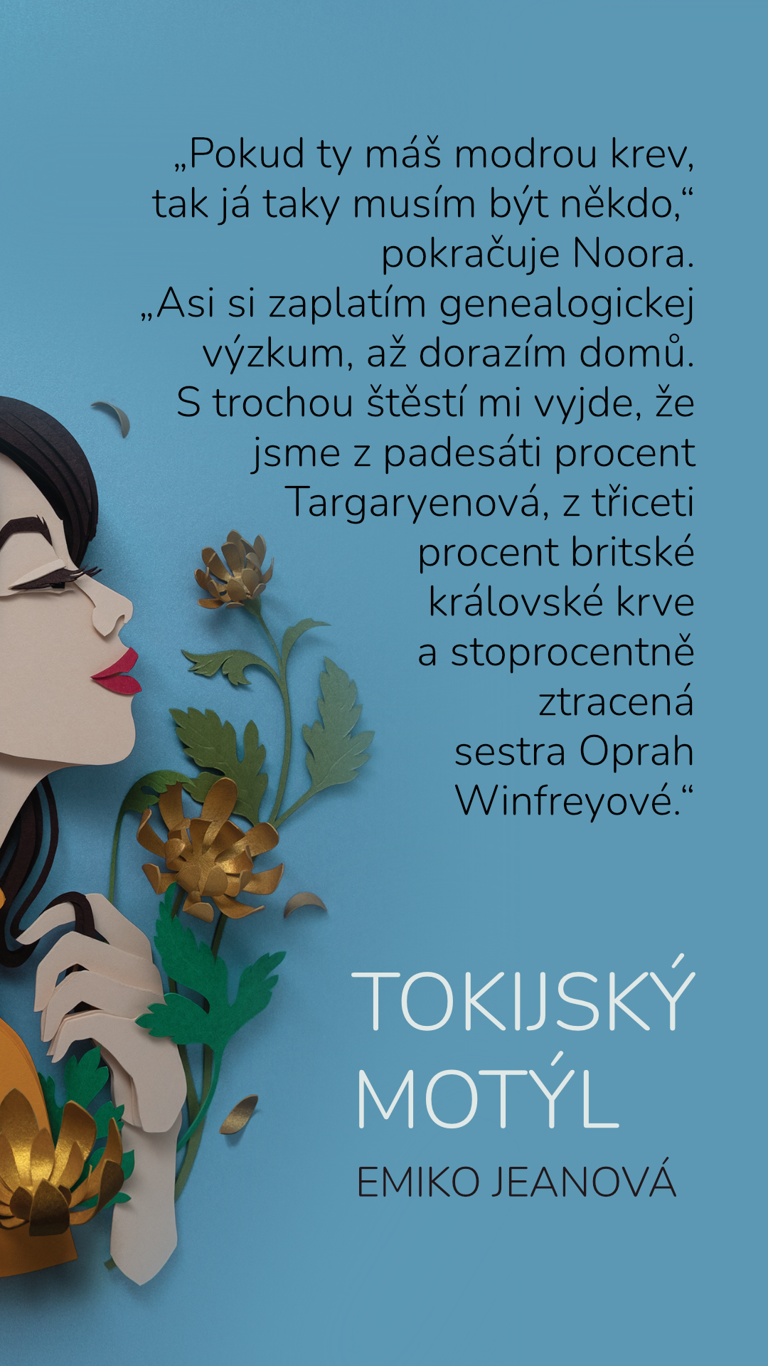 „Pokud ty máš modrou krev, tak já taky musím být někdo,“ pokračuje Noora. „Asi si zaplatím genealogickej výzkum, až dorazím domů. S trochou štěstí mi vyjde, že jsme z padesáti procent Targaryenová, z třiceti procent britské královské krve a stoprocentně ztracená sestra Oprah Winfreyové.“